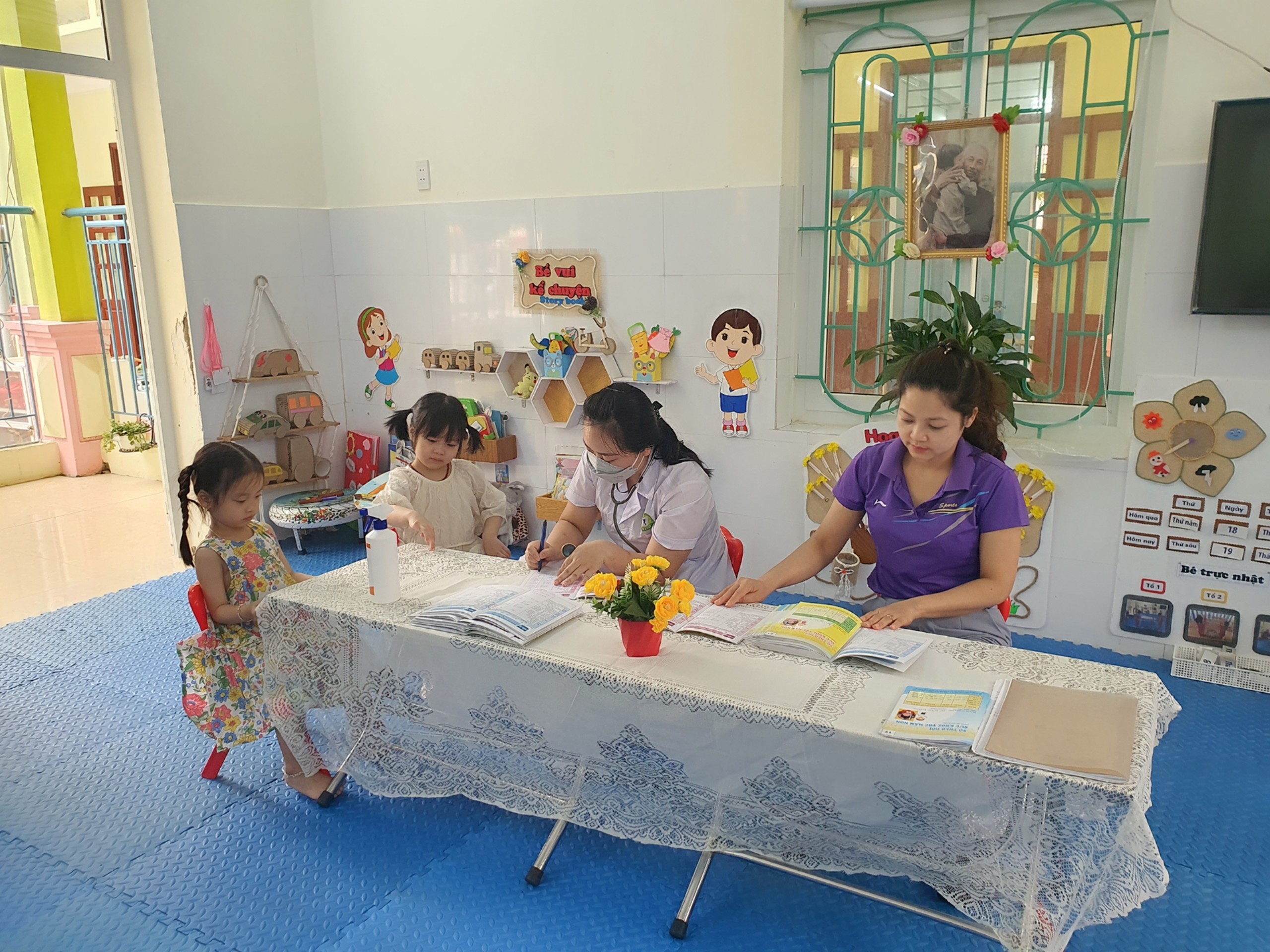 Buổi khám sức khỏe đã diễn ra thành công tốt đẹp. Các bạn nhỏ rất dũng cảm và hợp tác cùng các y bác sĩ. Dưới đây là một số hình ảnh của các y, bác sĩ và các bé trong buổi khám sức khoẻ sáng nay: