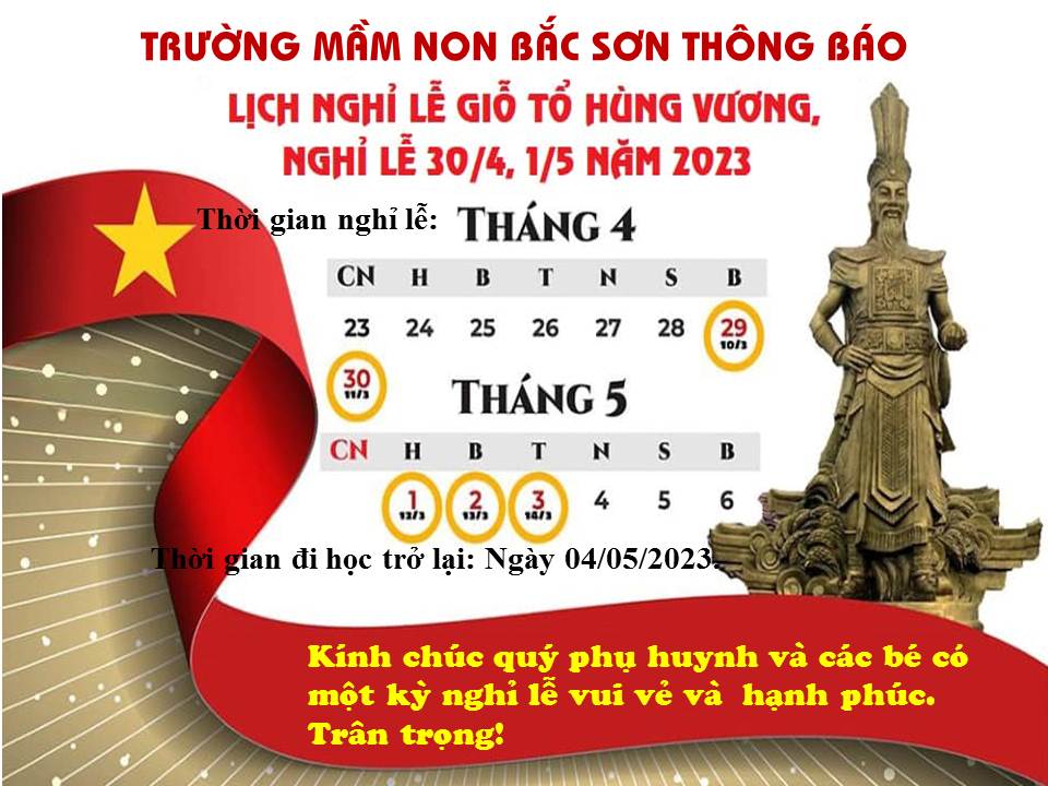 Trường mầm non Bắc Sơn xin thông báo tới các Quý phụ huynh học sinh về lịch nghỉ lễ như sau:
