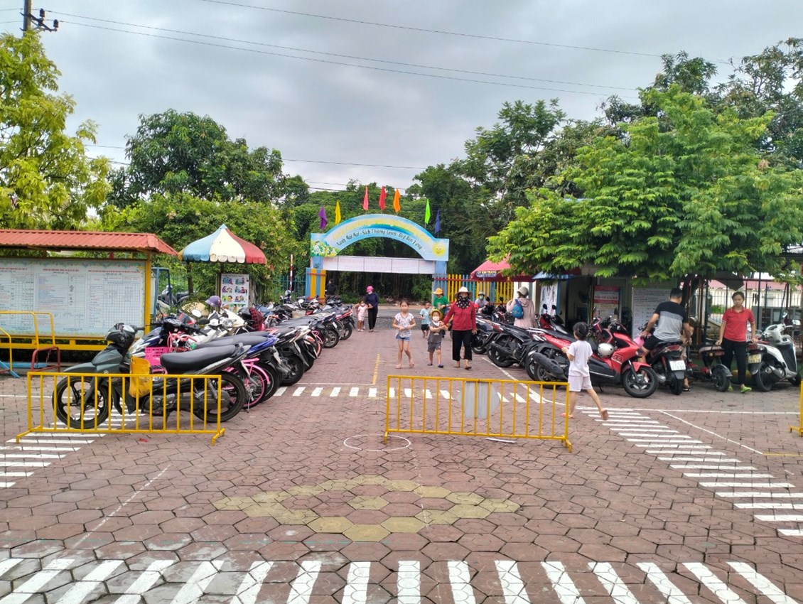 4.Bố mẹ đưa con đến trường bằng xe máy phải thực hiện đúng luật giao thông, quy định cho người đi xe máy. Người điều khiển xe và người ngồi sau xe phải đội mũ bảo hiểm có cài quai đúng quy cách. Bố mẹ nên trang bị cho mình và cho con mình loại mũ đạt chuẩn để đảm bảo an toàn cho mình và con em mình nếu có sự cố xảy ra. Khi đi đến trường kính mời các bậc phụ huynh không đi xe qua khu vực rào chắn vào sân trường, phụ huynh cần tuân thủ việc để xe gọn gàng theo sự chỉ dẫn của bác bảo vệ.